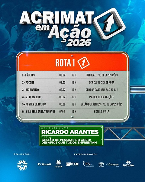 A primeira rota do Acrimat em Ação 2026 contempla seis municípios do Oeste de Mato Grosso, com encontros presenciais sempre às 19h. A programação começa no dia 2 de fevereiro, em Cáceres, no Tatersal do Parque de Exposições. No dia 3, o evento segue para Poconé, no CCR Clube Cidade Rosa. Em 4 de fevereiro, será realizado em Rio Branco (MT), na quadra da Igreja São Roque. No dia 5, chega a São José dos Quatro Marcos, no Parque de Exposições. A rota continua em Pontes e Lacerda, no dia 6, no Salão de Eventos do Parque de Exposições, e se encerra no dia 7 de fevereiro, em Vila Bela da Santíssima Trindade, no Hotel da Vila.