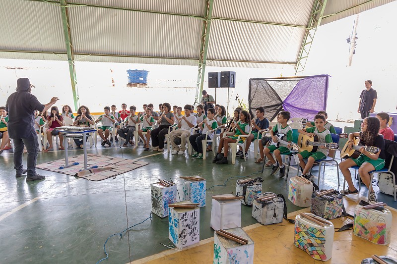 Alunos e professores formaram a ciranda do rock. Também houve uma apresentação de skate na quadra. No espaço, havia ainda tambores com materiais recicláveis produzidos pelos estudantes, com detalhes em tinta. Violões, antes em estado precário, foram pintados de branco e receberam pintura das mãos das crianças e adolescentes.