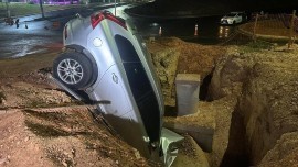 Uma mulher de 49 anos, que não teve o nome divulgado, perdeu o controle da direção e caiu com carro dentro da vala de uma obra, na avenida Milton Figueiredo, no Centro Político Administrativo, em Cuiabá, na noite desse domingo (5). Ela não ficou ferida.