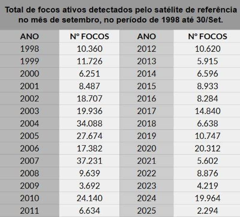 No mês de setembro de 2025, além de registrar o menor número de focos de calor da série histórica do Inpe, Mato Grosso apresentou uma redução de 88% em comparação com o mesmo mês de 2024, quando foram registrados 19.964 focos. No acumulado do ano, entre janeiro e setembro deste ano, o Estado contabilizou 9.171 focos de calor enquanto no mesmo período do ano anterior, foram registradas 45.326 ocorrências, o que representa uma redução de 80%. Ou seja, quase cinco vezes menos focos.