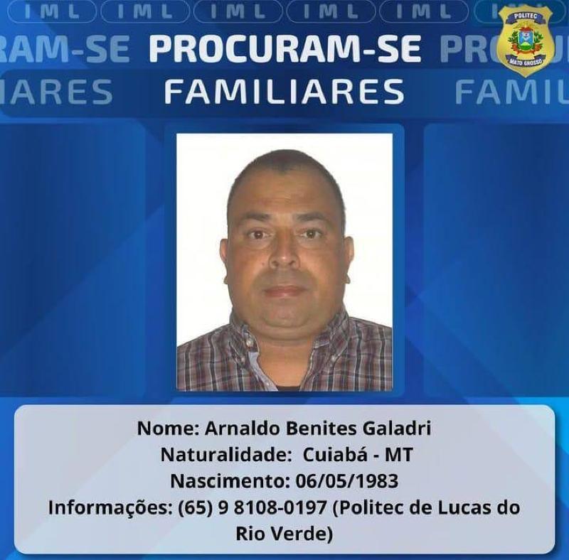 Também são procurados os familiares de Arnaldo Benites Galadri, vítima de homicídio ocorrido no dia 24/09, em Lucas do Rio Verde/MT. Arnaldo nasceu em 06/05/1983, em Cuiabá/MT, e é filho de Maximina Benites Galadri e Epifânio Galadri.