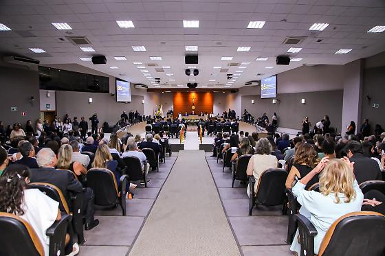 Na sequência, foram anunciados e recebidos no plenário 35 juízas e juízes, que ingressaram pelo corredor central. O momento solene contou ainda com a execução do Hino Nacional Brasileiro e do Hino do Estado de Mato Grosso, interpretados pela Banda de Música da Polícia Militar de Mato Grosso.