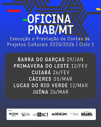 As oficinas presenciais acontecerão em seis cidades, começando por Barra do Garças (29.01). Na sequência ocorrerão em Primavera do Leste (12.02), Cuiabá (26.02), Cáceres (05.03), Lucas do Rio Verde (12.03) e Juína (26.03). Já as oficinas teles presenciais serão realizadas por demanda, com atendimentos práticos agendados via central tira dúvidas na internet, por meio do site https://mutirum.com/pnab-mt/