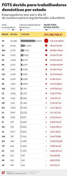 De acordo com relatório divulgado em primeira mão pelo g1, cerca de 80,5 mil empregadores não haviam depositado o FGTS até setembro. No total, são mais de 154 mil trabalhadores domésticos em todo o país, com débitos que somam mais de R$ 375,1 milhões.