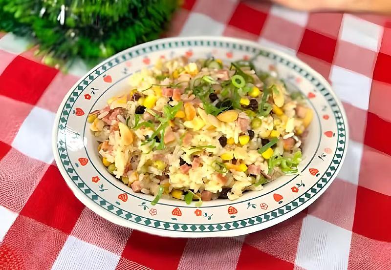 4 - Adicione as uvas-passas, ervilha, milho e amêndoas em lâminas. Misture e sirva.