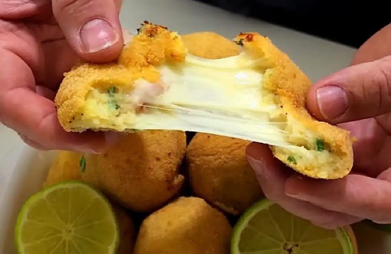 - Retire a batata temperada da geladeira, pegue um pedaço da massa, abra com as mãos, coloque a muçarela e o presunto em pedaços, enrole formando uma bolinha. Repita esse processo com toda a batata.