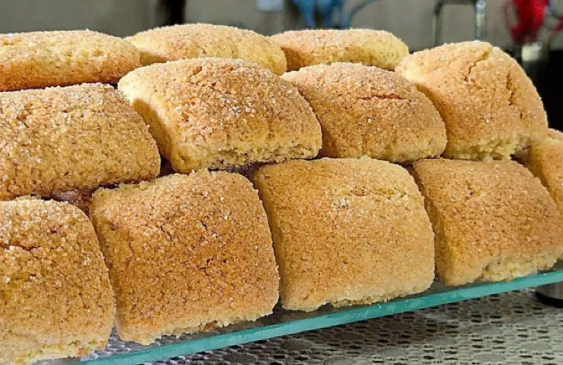 - Pegue pedaços da massa, faça um rolinho comprido, passe o rolo por cima achatando levemente, corte em pedaços da espessura de 3 dedos, coloque-os em uma forma untada e enfarinhada e polvilhe açúcar cristal por cima.