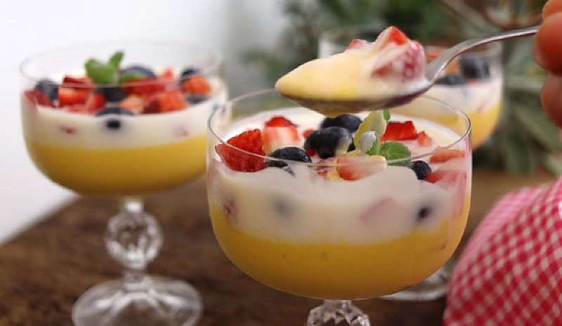 6 - Passe a mistura do iogurte para o(s) recipiente(s) com o creme de manga já gelado delicadamente para não se misturarem.