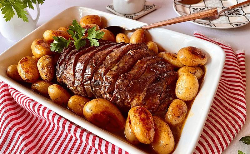 Transfira o cupim para uma travessa, disponha as batatas em volta dele e despeje o caldo da panela por cima do preparo;