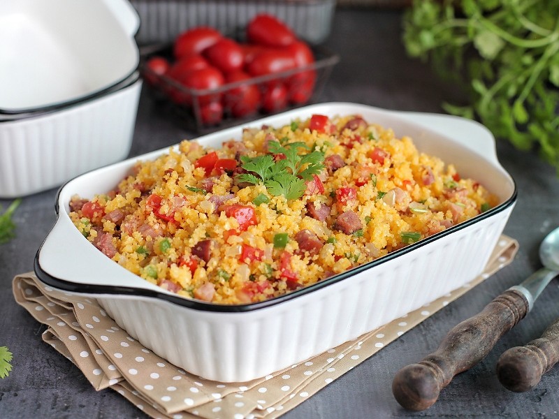 - Coloque água na parte inferior da cuscuzeira e transfira o flocão hidratado para a parte superior da cuscuzeira sem apertar, mantendo a textura soltinha;