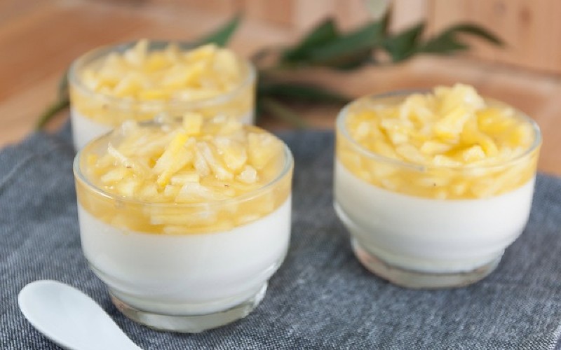 6- Em um refratário, faça uma camada com o doce de abacaxi, outra com o creme e outra com a cobertura.