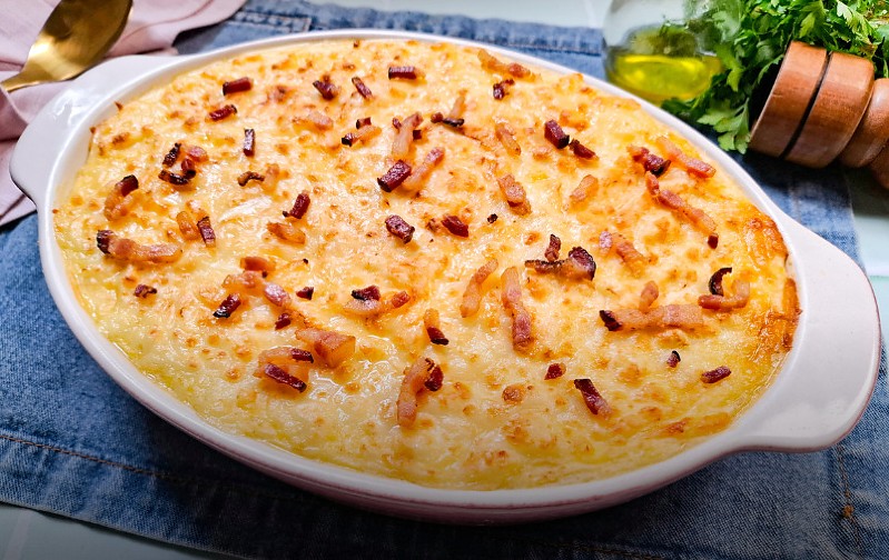 - Cubra com o restante do creme de mandioca, formando duas camadas. Por fim, se desejar gratinar, finalize com queijo ralado a gosto e o bacon por cima;