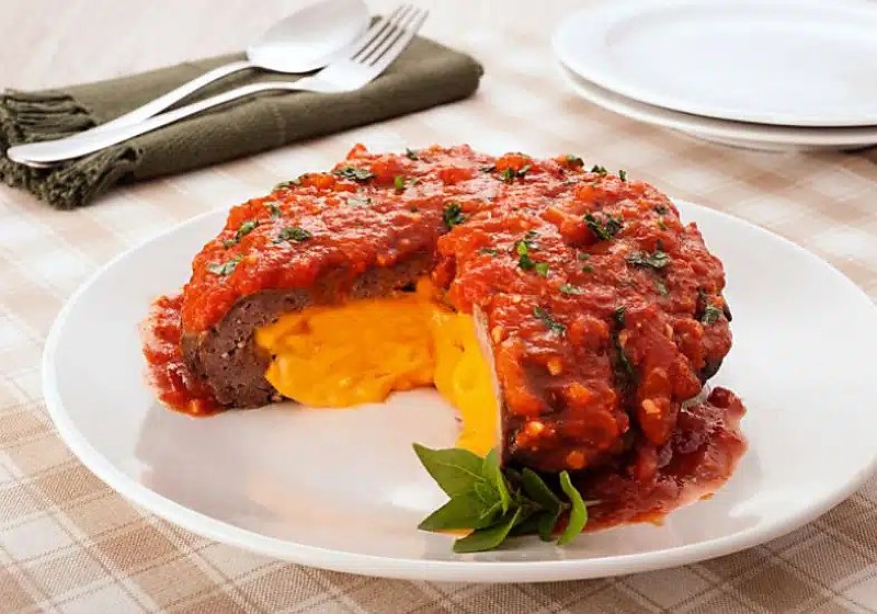 Forme dois bifes redondos. Num deles, espalhe o queijo, mas deixe uma borda sem esse ingrediente. Cubra com o outro pedaço da carne e aperte as bordas para fechar bem.