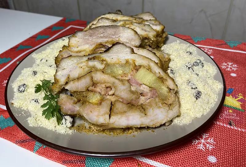 3 - Em seguida, abra novamente o lombo e recheie com o abacaxi e as fatias de bacon.