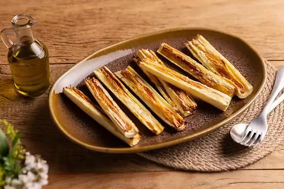 4 - Coloque os palmitos no cesto da air fryer com a parte cortada para cima e deixe assar por 20 minutos, até dourar — não precisa virar na metade do tempo. Sirva a seguir.