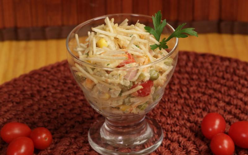 Arrume a mistura em uma travessa e na hora de servir, coloque a batata palha por cima.