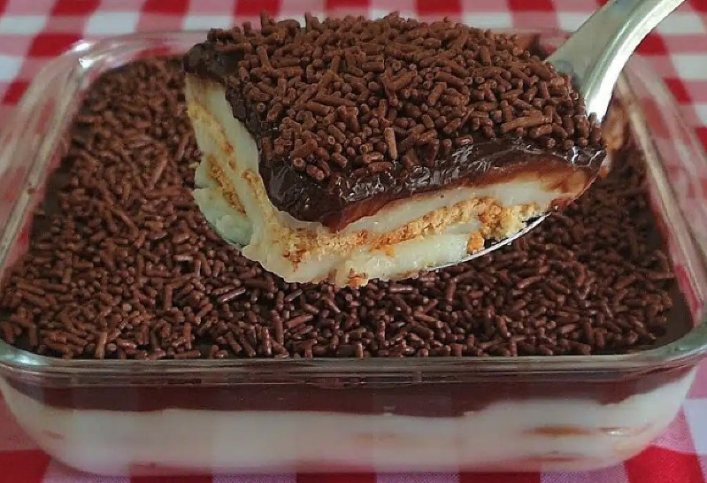 - Despeje essa mistura sobre o creme no refratário, finalize com granulado de chocolate e leve para gelar por 4 horas.