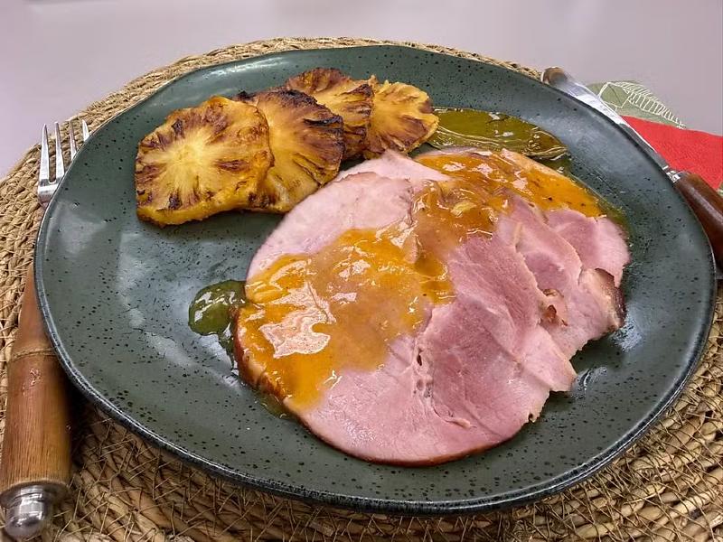 7 - Quando completar o tempo, retire o tender e o abacaxi do forno. Corte o tender em fatias e sirva com o abacaxi.