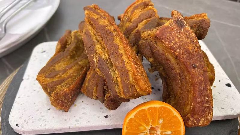 3 - Depois deste tempo, retire da geladeira, coloque em uma panela com banha de porco aquecida a 15 graus Célsius (fogo alto), misture com uma escumadeira, deixe a panela com a tampa entreaberta e deixe fritando por 40 minutos (de vez em quando, retire a tampa e misture bem com a escumadeira para não grudar no fundo). Dica: a banha derretida precisa cobrir todas as tiras de barriga.