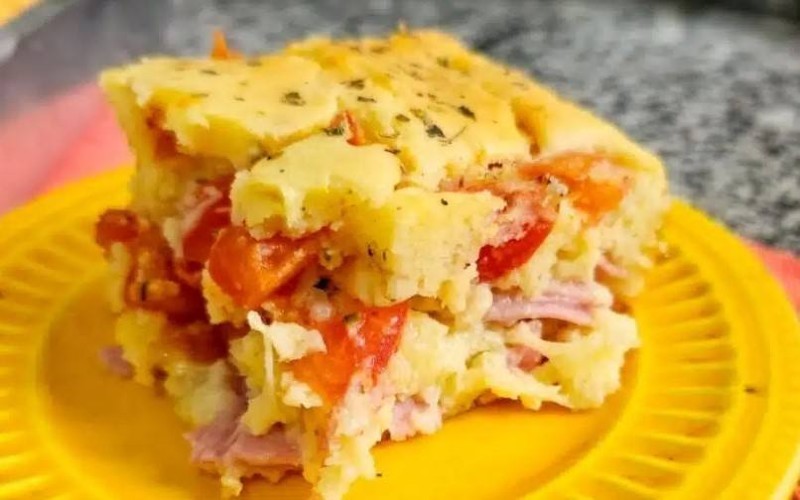 - Despeje metade da massa em uma forma retangular untada e enfarinhada, faça uma camada de presunto picado, muçarela ralada, tomate picado sem semente com chimichurri e cubra com o restante da massa.