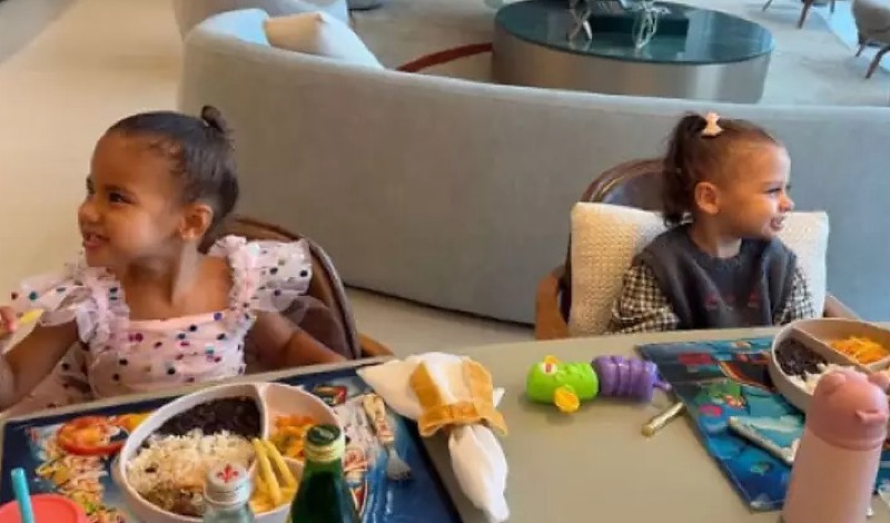 O "Almoço das princesas", como ele carinhosamente legendou o momento, mostrou as meninas sentadas lado a lado, com pratos coloridos e copinhos infantis. No cardápio, o clássico brasileiro: feijão, arroz, carne, legumes e batata frita.