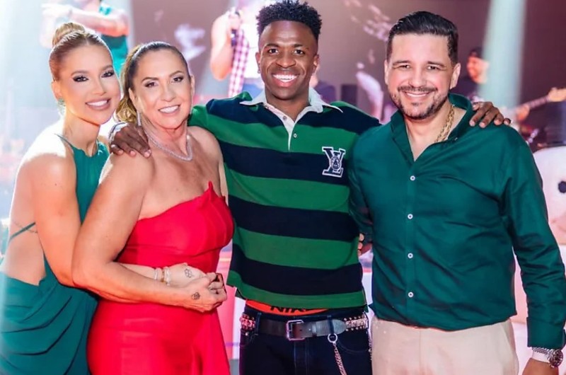 Na legenda da imagem, o sanfoneiro — que integra a dupla Danilo e Murilo — elogiou o jogador e brincou com a possibilidade de vê-lo feliz no futebol brasileiro. “Jesus te abençoe, Vini! Fiquei encantado com a sua humildade! Venha ser feliz no verdão”, escreveu.