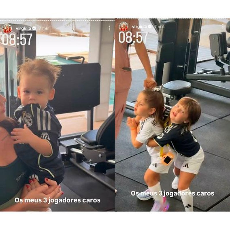 Nesta quinta-feira (15), Virginia se divertiu e se derreteu ao ver os três filhos usando os uniformes do time do Real Madrid, onde Vini Jr, seu namorado, joga atualmente.