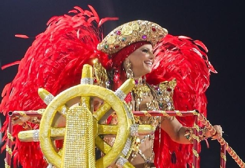 Se tem uma coisa que Viviane Araújo sabe fazer é roubar a cena na avenida. E no Carnaval 2026 não foi diferente. A Rainha de Bateria surgiu com uma fantasia luxuosa, rica em pedrarias e totalmente fora do óbvio. O figurino, com referência ao universo pirata incluindo tapa-olho e um poderoso chapéu estilizado, que chamou atenção pelo acabamento impecável e pelo brilho intenso.