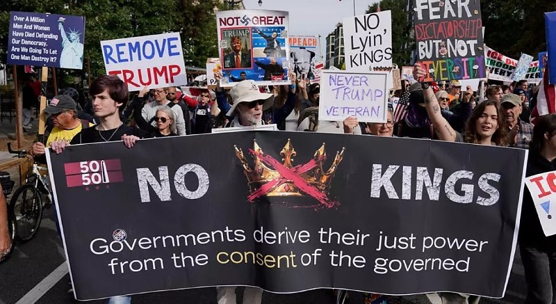 Reunidos sob o lema "Sem reis", milhões de americanos devem marchar para denunciar a “virada autoritária" do presidente republicano, anunciaram os organizadores. No bairro de Forest Hills, em Nova York, centenas de pessoas se reuniram no meio da manhã, entoando o slogan "Amamos nosso país, não suportamos Trump".
