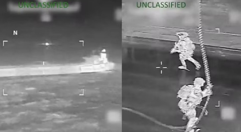 Um vídeo da apreensão compartilhado pelo Exército dos EUA mostra uma aeronave chegando de helicóptero ao petroleiro e, em seguida, tropas descendo de corda a bordo do Veronica.