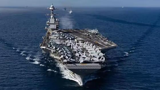 O grupo de ataque do porta-aviões inclui esquadrões de caças F-18, helicópteros militares, além de três destróieres — o USS Mahan, USS Bainbridge e USS Winston Churchill.