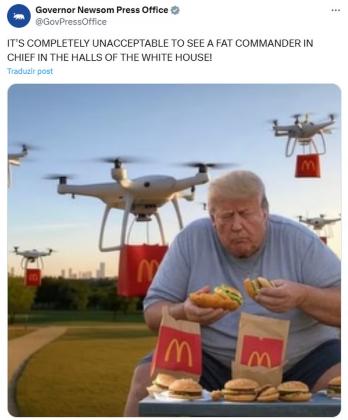 Newsom, do Partido Democrata e opositor de Trump, reagiu publicando no X o vídeo do discurso de Hegseth acompanhado de uma montagem de Trump comendo sanduíches, tirando o paletó. Na legenda, o democrata ironizou: “Acho que o Comandante em Chefe precisa ir embora!”.