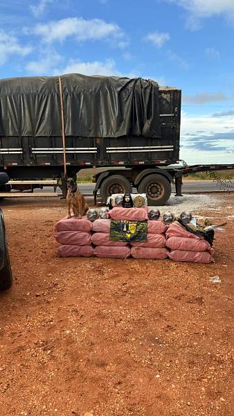 Diante da suspeita, os cães farejadores foram empregados e indicaram, de imediato, a presença de odor característico de substância entorpecente. Em seguida, foi realizada uma vistoria minuciosa na carga e, ao levantar a lona da carreta, os policiais localizaram fardos com características típicas de entorpecentes, misturados ao material transportado, além de embalagens incompatíveis com o produto declarado.