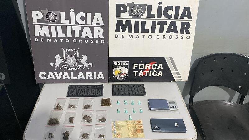 Policiais militares da Cavalaria de Nova Mutum prenderam, nesta terça-feira (27.1), dois homens suspeitos por tráfico ilícito de drogas e apreenderam 73 porções de entorpecentes, entre maconha e pasta base de cocaína, além de outros materiais utilizados para preparo e comercialização dos ilícitos.