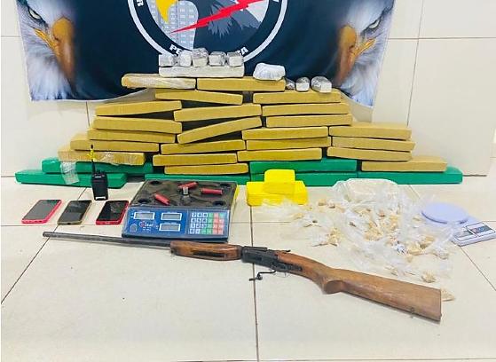 Além das drogas, foram apreendidas duas balanças de precisão, um rádio comunicador, uma espingarda calibre .28, munições e diversos pacotes para armazenamento dos ilícitos. Os suspeitos e todo material apreendido foram entregues à delegacia para registro do boletim de ocorrência.