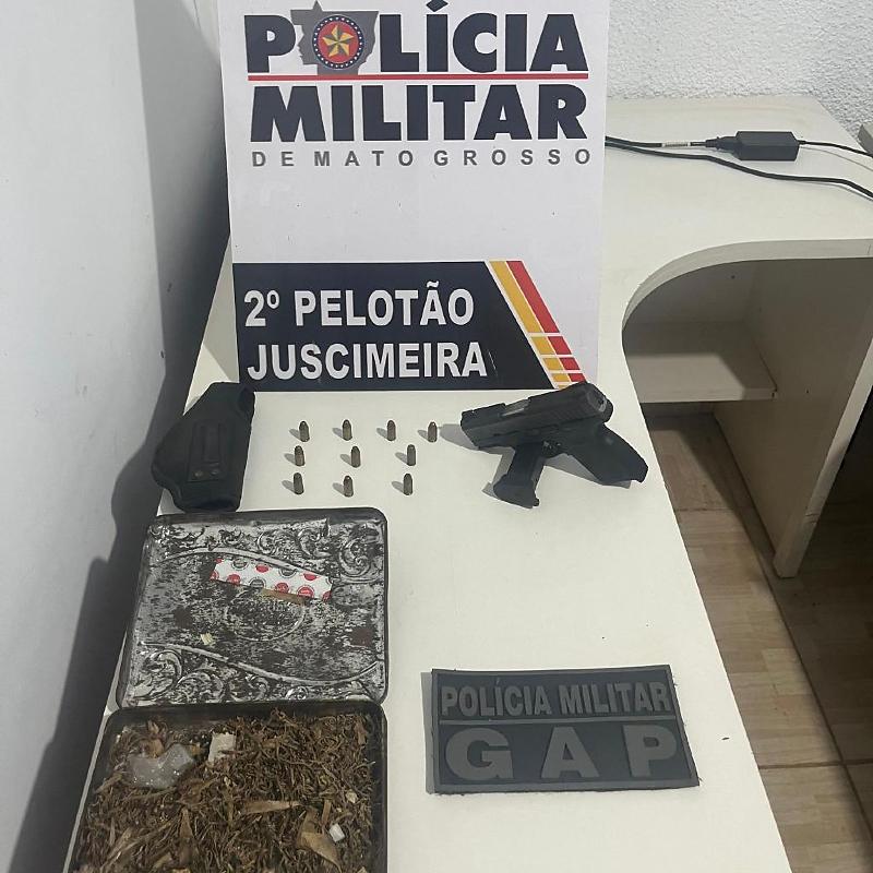 A Polícia Militar de Mato Grosso prendeu um homem, de 46 anos, por porte ilegal de arma, tráfico de drogas e embriaguez ao volante, na noite desta quinta-feira (20.11), na cidade de Juscimeira. O suspeito foi flagrado com uma pistola, 10 munições e porções de maconha, dentro de uma caminhonete.