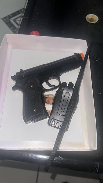 Ao ser abordado, os militares identificaram que se tratava de um simulacro de arma de fogo. Além disso, o suspeito portava um rádio comunicador na cintura. O homem foi detido em flagrante.