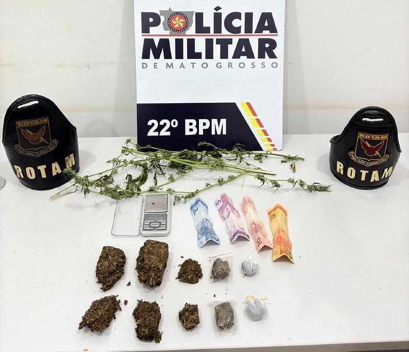 Policiais militares do Batalhão de Ronda Ostensiva Tática Móvel (Rotam) prenderam, na noite desta segunda-feira (20.10), um integrante de facção criminosa suspeito por tráfico de drogas e cultivo de cannabis, em Peixoto de Azevedo (673 km de Cuiabá). As equipes apreenderam dez porções de substância análoga à maconha, duas mudas e uma balança de precisão.