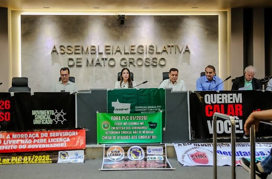 A matéria enviada pelo Governo de Mato Grosso para análise da Assembleia Legislativa foi criticada pelos presentes. O texto prevê a concessão de licença por um mandato classista, podendo ser prorrogada uma vez, em caso de reeleição para a mesma função. “Esse projeto significa dizer que seremos calados e amordaçados na busca por nossos direitos. Isso é inadmissível. Mato Grosso não pode protagonizar uma legislação que fere princípios constitucionais e recomendações de organismos internacionais”, afirmou a presidente da Federação Sindical dos Servidores Públicos de Mato Grosso, Carmem Machado.