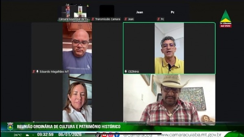 A Comissão de Cultura e Patrimônio Histórico da Câmara Municipal de Cuiabá realizou nesta terça-feira (6), reunião ordinária para apresentação do balanço das ações desenvolvidas pela Secretaria Municipal de Cultura ao longo de 2025. A comissão é presidida pelo vereador Cezinha Nascimento (União Brasil) e composta pelos vereadores Eduardo Magalhães (Republicanos) e Maria Avalone (PSDB).